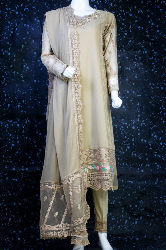 Elegant Chiffon Shirt with Satin Trouser & Matching Dupatta