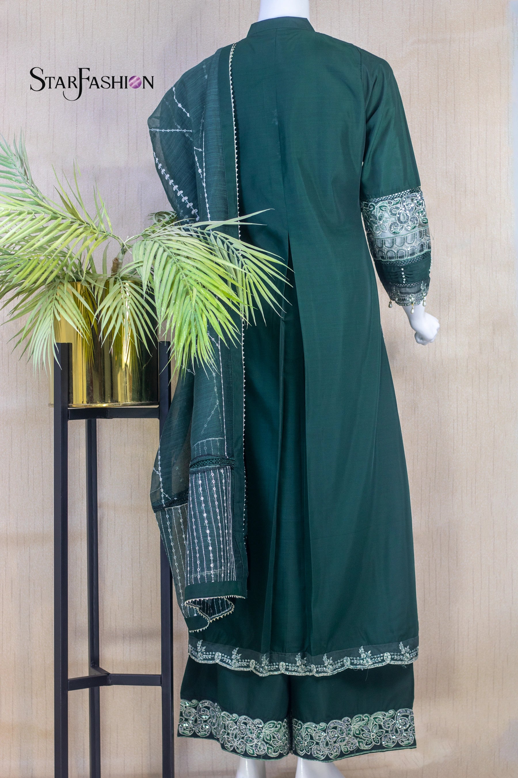 A bold, modern silhouette brought to life with striking hues that make a statement. Crafted from premium silk, this ensemble features a graceful shirt paired with raw silk palazzo pants and a textured khaddi dupatta. A malai slip is included for added comfort and effortless elegance.