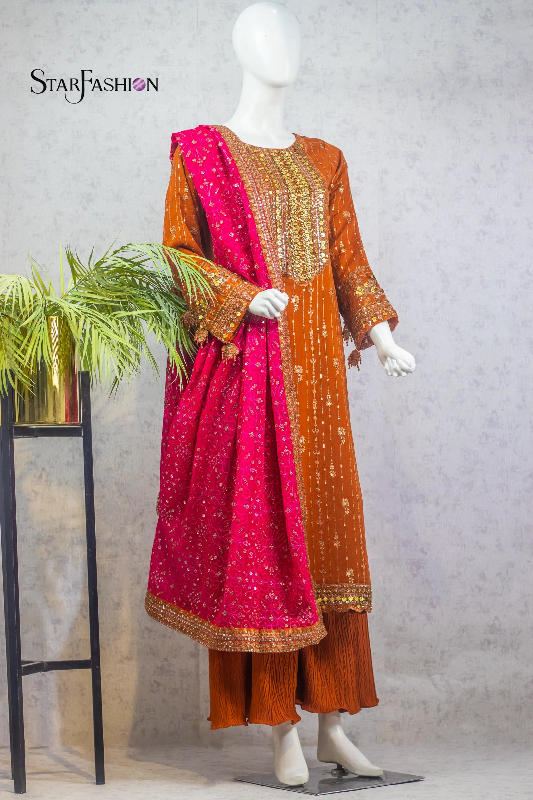 Rust Chiffon 3-Piece Dress with Embroidered Dupatta