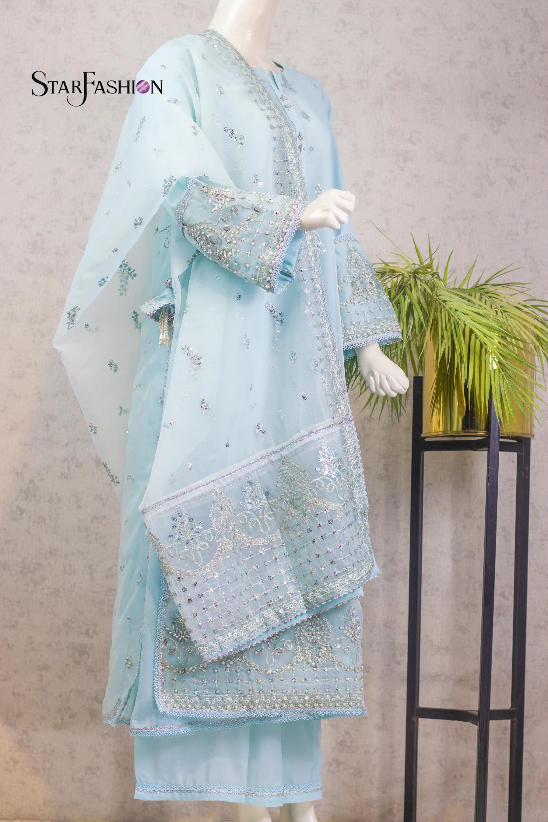 A sky-kissed canvas brought to life with whimsical intricacies. Crafted from soft crepe and delicate organza, this long gown top exudes subtle grandeur. Paired with a matching organza dupatta and crepe loose trousers, it blends effortless grace with modern refinement. A slip is included for seamless wear.